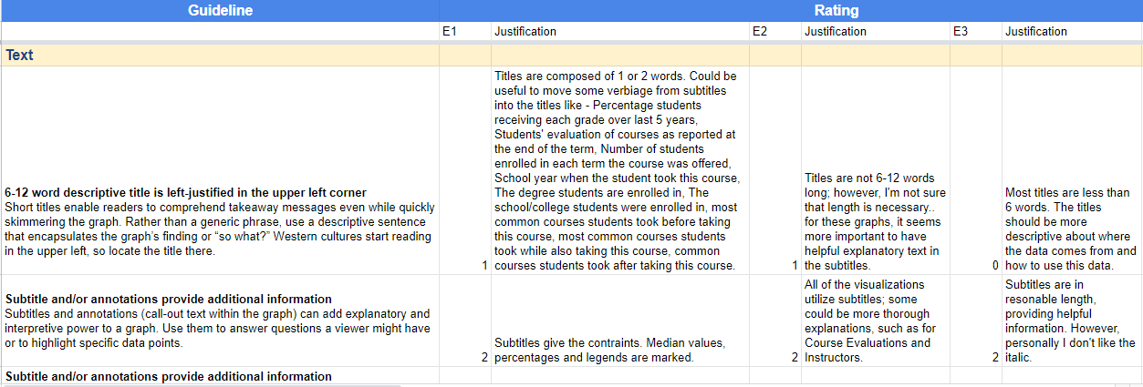Using the Data Visualization Heuristic Checklist that was adapted from Dr. Stephanie Evergreen and Ann K. Emery, we analyzed the text, arrangement, color and lines based on given guidelines of data visualizations on a single Course Profile page on Atlas. Specifically, we looked at the page for the course STATS 250. Myself and 2 other colleagues went through the page individually and each gave rated the graphics against each guideline within the checklist. Then, we averaged our scores and calculated percentages by dividing the category score by the total points possible for that category. If the percentage was between 90-100%, then that category was considered okay. If the percentage was lower, then we further evaluated our individual responses and have provided takeaways in the next section.