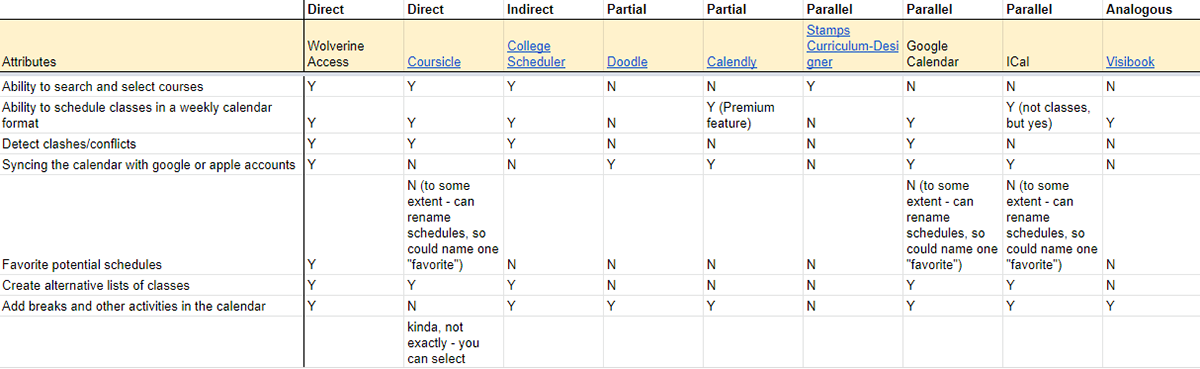 We listed down a few competing platforms that have diverse scheduling abilities and associated features. These platforms fell under the categories - direct, indirect, partial, parallel and analogous. We then listed down all the features as comparators and marked yes(y), no(n) or to some extent against each platform which can be found in the spreadsheet with raw feedback.